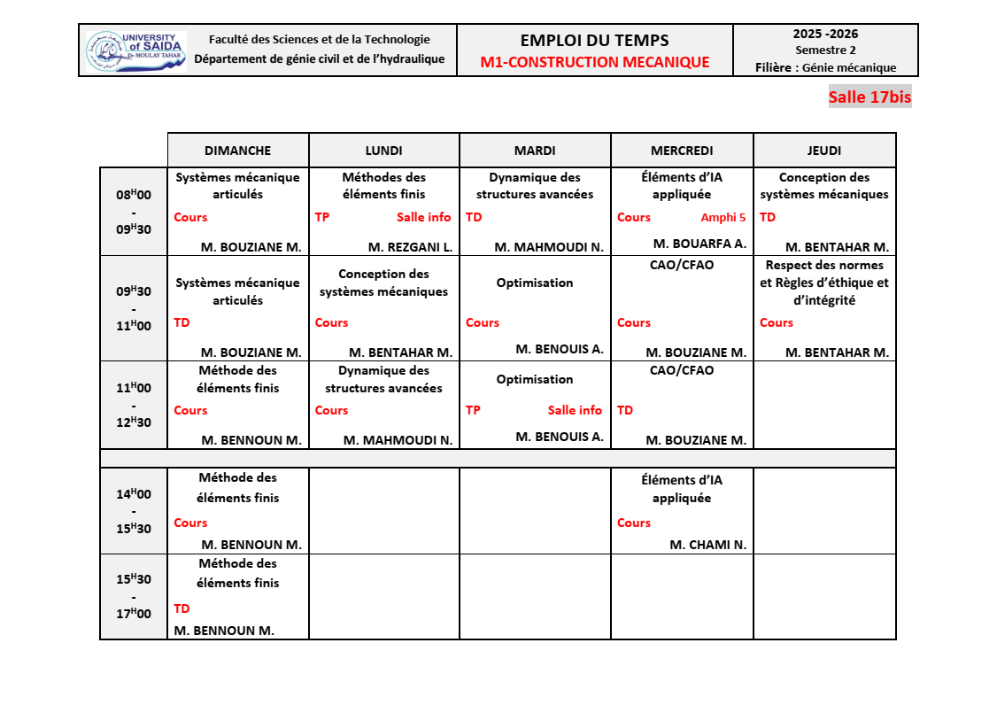 الكليات / MIT كلية الرياضيات و الإعلام الآلي و الاتصالات السلكية و اللاسلكية / قسم الاعلام الالي / السداسيات الفردية