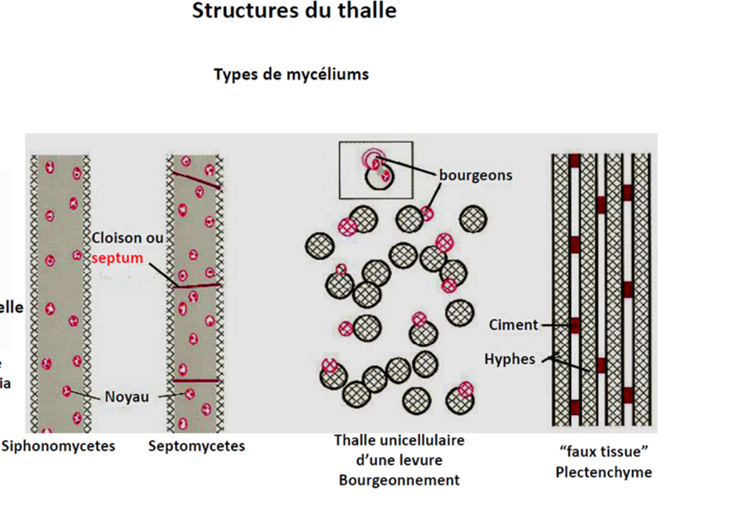 L’organisation cellulaire des champignons est appelée le thalle. Chez les champignons microscopiques, le thalle peut être unicellulaire (levures) ou filamenteux (moisissures).