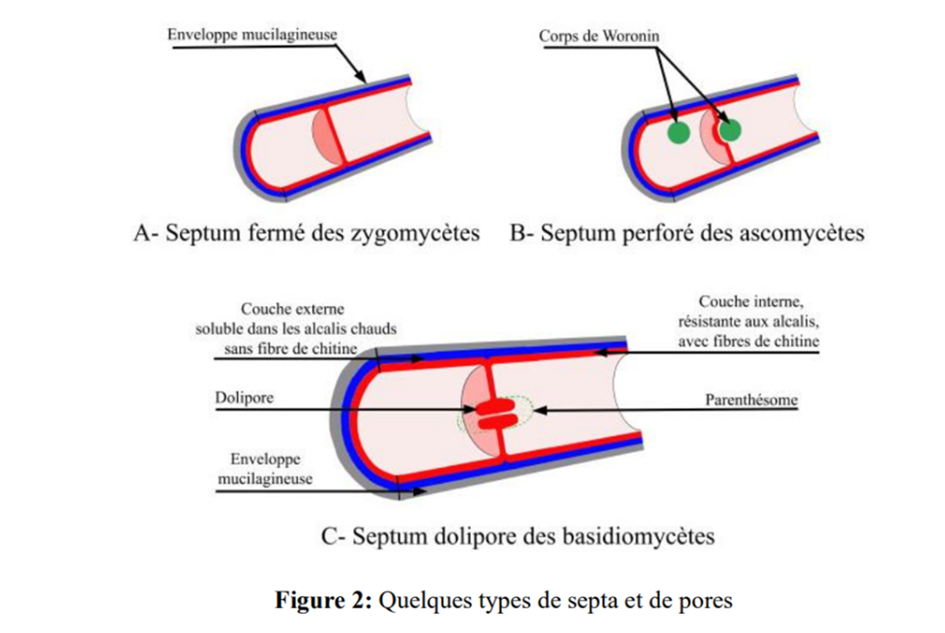 Les ascomycètes ont des septa perforés dont le pore peut être ouvert ou fermé par un corps membraneux composé de protéines appelé « corps de Woronin » (Fig. 2-B).