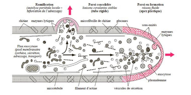 - Sa position dans l’apex détermine la direction de l’élongation de l’hyphe (croissance rectiligne ou ramification).