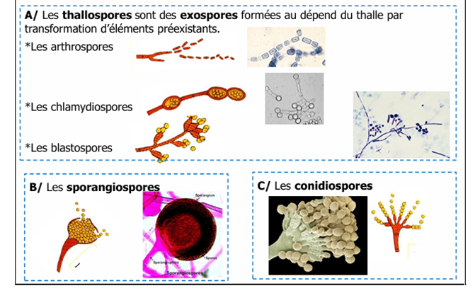 • Dictyospores : spores multicellulaires formées après plusieurs divisions successives (ex. Alternaria).