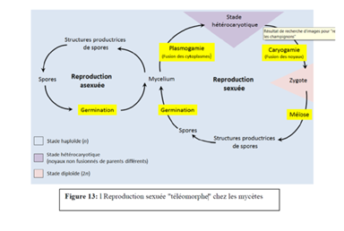 • La reproduction sexuée (téléomorphe), moins fréquente, mais assurant une recombinaison génétique et jouant un rôle fondamental dans la classification.