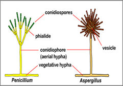 • Conidies (ou conidiospores) : produites exogènement, à l’extrémité de structures spécialisées :