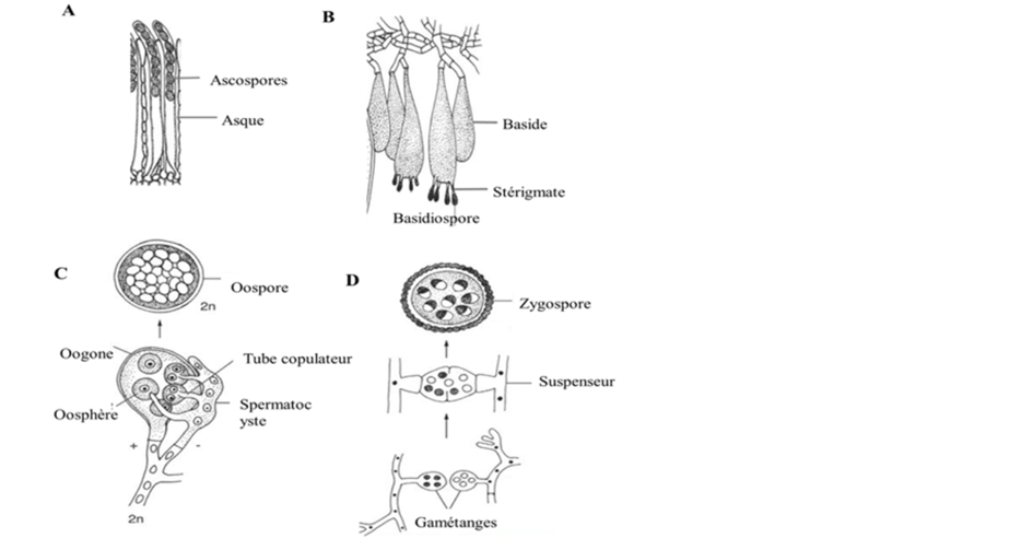 A : Ascospores, B : Basidiospores, C : Formation de l’oospore, D : Formation de la zygospore.