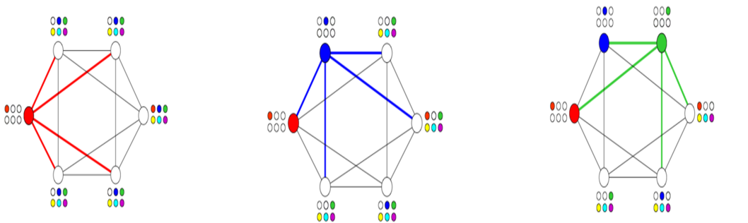 Initially all nodes can be {red, blue, green, yellow, blueciel, purple} They represent the        domains of variables.