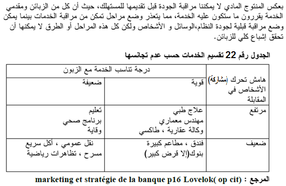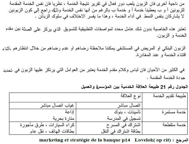 (ﺟ) _ التبايــن ( Hétérogénéité ) : الجميع يرى أن نجاعة الخدمة تتغير من مؤسسة إلى أخرى، ومن وكالة إلى أخرى خاصة للخدمات التي تعتمد على التدخل الكبير للعنصر البشري، لذا يقوم الزبون بترتيب العناصر قبل الشراء حتى يتمكن من المقارنة بين عروض الخدمات، ويصعب على مقدِّم الخدمة تقديم خدمات متجانسة في الوقت والمكان.