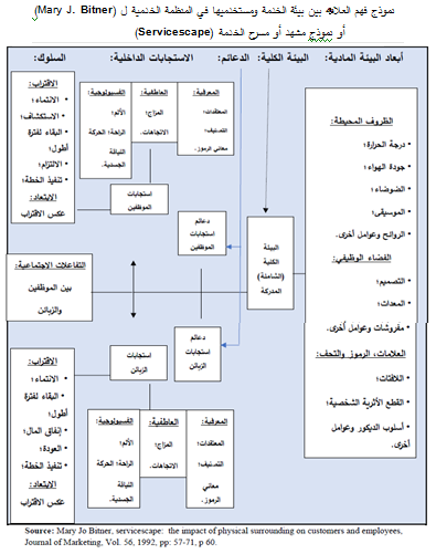 أشارت الباحثة (Mary J. Bitner) سنة 1992 في دراستها الموسومة ب "لقاء الخدمة: تأثير المحيط المادي على الزبائن والموظفين"، إلى أن بيئة الخدمة للمنظمة تؤثر على العملاء، والموظفين على حد سواء إذا ما تم النظر إلى التفاعل القائم في سياق التبادل والتعامل بين الأفراد، لذلك ينبغي أن تكون الخدمات مصممة لتلبية احتياجات أولئك الأفراد الذين يقضون وقت معتبر داخل حدود المنظمة، و قد أشارت الباحثة في سياق تحليل وتوضيح السلوك البشري في مجال الخدمات كونه يتأثر بالإعدادات المادية، وقدمت إطارا لفهم العلاقة بين البيئة المادية والمستخدمين لها كما هو موضح في الشكل الموالي: