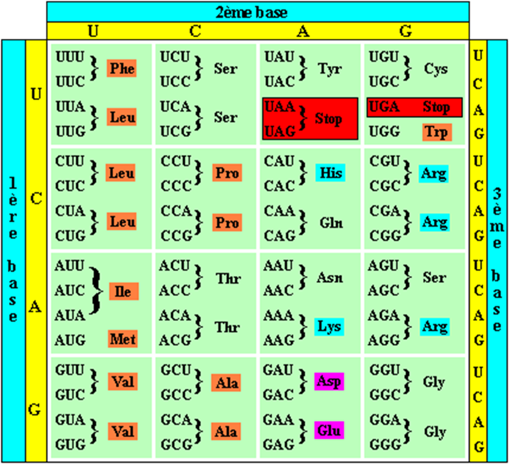 L’ADN est le support de l’information génétique chez tous les êtres vivants. Il est fabriqué à partir d’un alphabet de seulement quatre lettres (A, T, G, C), les nucléotides. L’enchaînement de ces nucléotides forme le génome, dont une partie est traduite sous forme de protéines, nécessaires à la vie. L’information portée par l’ADN est d’abord transcrite en un ARN messager (ARNm), également fabriqué à partir de quatre nucléotides (A, U, G, C). Cette première étape, nommée transcription, permet d’amplifier le message de départ tout en préservant l’ADN de la chimie caustique de la cellule. Les ARNm sont ensuite traduits par triplets de nucléotides (ou codons) en l’un des vingt-deux acides aminés composant les protéines. Cette synthèse protéique, ou traduction, permet le passage d’un alphabet de quatre lettres (les nucléotides qui composent l’ADN et l’ARNm) à un alphabet de vingt-deux lettres (les acides aminés qui composent les protéines). Elle est portée par une machine moléculaire très complexe et dynamique : le ribosome.