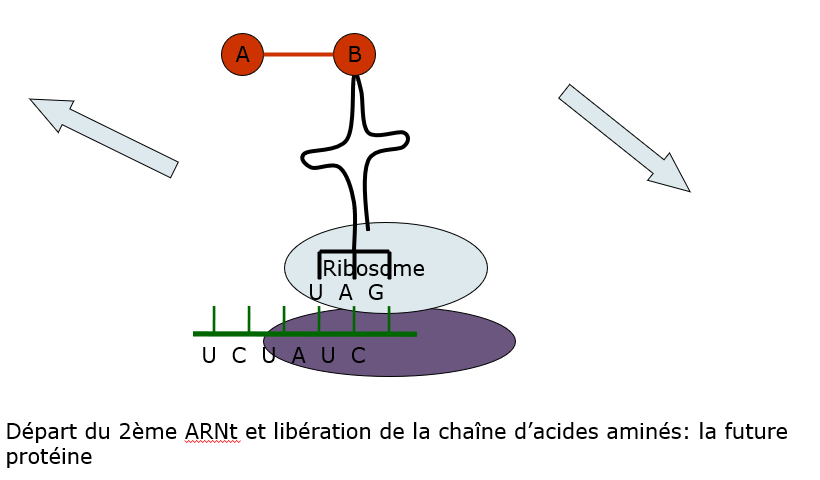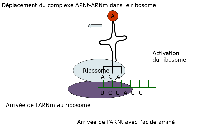 Le brin d'ARNm s'attache au ribosome. En fait, il s’attache d’abord à la petite unité. C’est à ce moment que la grosse unité vient se fixer. Donc, les deux unités ne s’assemblent  que lorsque l’ARNm se fixe à la petite unité.