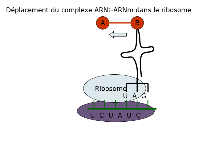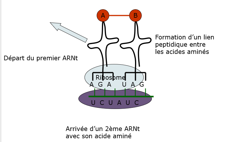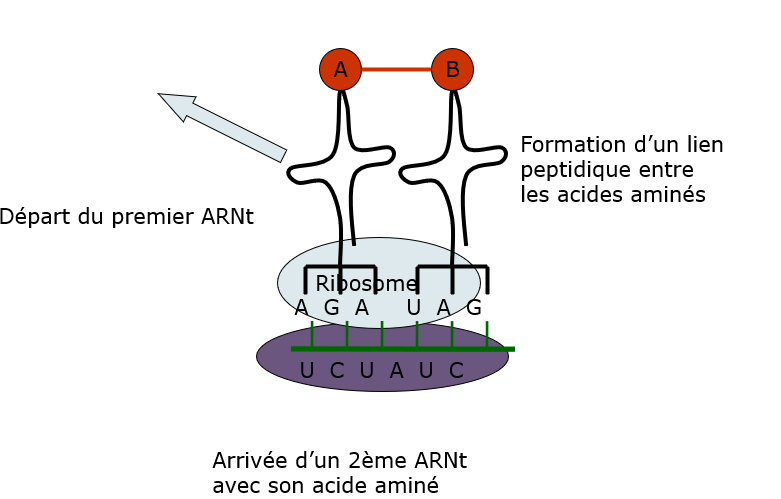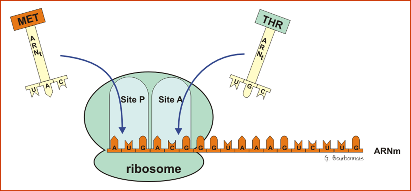 Deux ARNt peuvent se fixer par leur anticodon sur l’ARNr au niveau du ribosome (un sur la zone appelée site P et l’autre sur la zone appelée site A).
