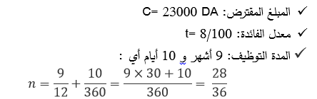 أودع شخص مبلغ 23000 دج لدى البنك لمدة 9 أشهر و 10 أيام بمعدل فائدة سنوي بسيط مقدر بـ% 8 .