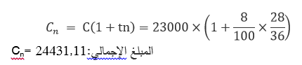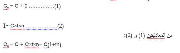 إذا أودع شخص في بنك مبلغا من المال قدرهC لمدة قدرهاn وكان معدل الفائدة في هذا البنك هو t فإنه في نهاية المدة الزمنية المتفق عليها يكون لهذا الشخص قيمة المبلغ الذي أودعه بالإضافة إلى قيمة الفائدة I التي يحصل عليها من البنك ومجموع المبلغين يسمى الجملة أو القيمة المكتسبة أو الرصيد و التي يرمز لها بالرمز Cn وتحسب بالعلاقة التالية: