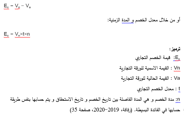 ü الخصم: هو المبلغ الذي يطرحه من مبلغ الدين ( القيمة الاسمية) في مقابل سداده قبل موعد استحقاقه، و نرمز له بـ Ec .