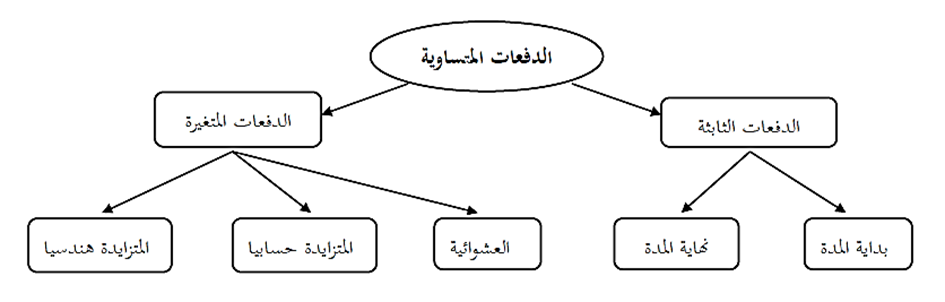 ويمكن تصنيف الدفعات المتساوية إلى نوعين أساسيين، دفعات ثابتة ودفعات متغيرة و هذا على أساس مبلغ الدفعة أما على أساس مدة الدفع فهناك نوعين دفعات بداية المدة ودفعات نهاية المدة. الشكل التالي يوضع نوع الدفعات التي سنتطرق إليها: