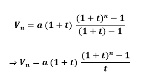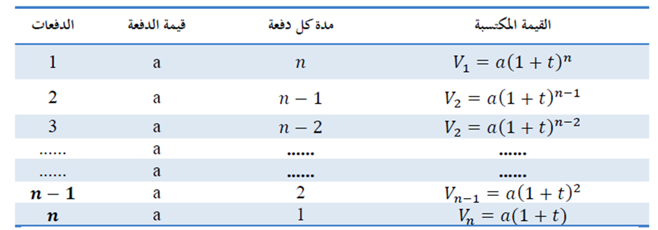 و بالتالي فإن مجموع هذه القيم المكتسبة للدفعات تشكل متتالية هندسية حدها الأول a(1+t) و أساسها (1+t) و حدها الأخير a(1+t)n-1 و عدد حدودها n.