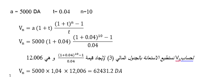 قام شخص بإيداع مبلغ مالي قيمته 5000 دج في بداية كل سنة ولمدة 10 سنوات متتالية، فما هي القيمة المكتسبة التي سيتحصل عليها بعد نهاية المدة المتفق عليها إذا كان معدل الفائدة المركبة هو 4 % سنويا.