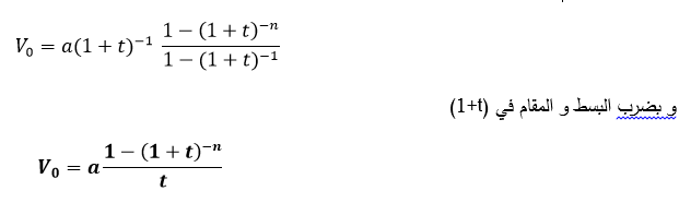 لدينا a مضروبة في متتالية هندسية أساسها (1+t)-1 و حدها الأول يساوي (1+t)-1 و عدد حدودها n.
