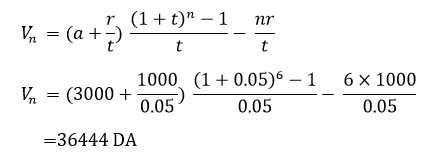 وظف شخص 6 دفعات سنوية تتزايد بقيمة 1000 دج سنويا حيث قيمة الدفعة الأولى 3000 دج و ذلك بمعدل فائدة مركبة 5% .