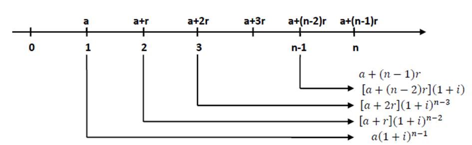 Vn= a(1+t)n-1 +[a+r](1+t)n-2 +[a+2r](1+t)n-3 + ………. +[a+(n-2)r](1+t) + a+(n-1)r