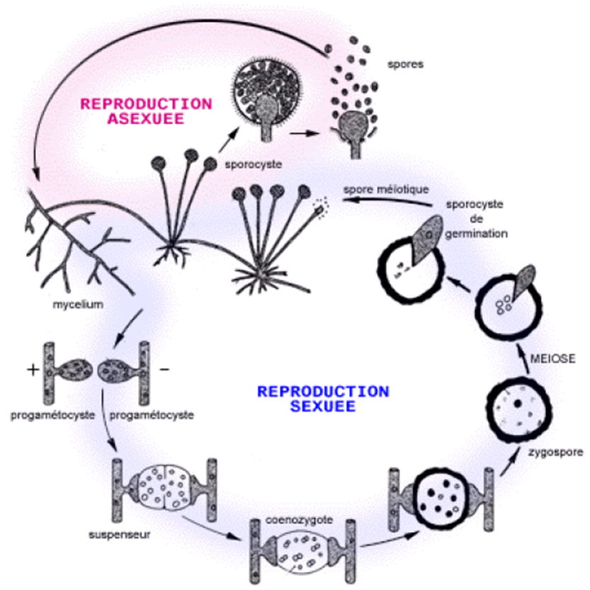Deux filaments mycéliens de types sexuels opposés (+ et –) s’approchent et forment des progamétanges, qui fusionnent pour donner un zygospore.