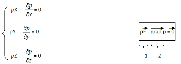 Les équations ci dessus sont appelées équations fondamentales de l’hydrostatique (équations d’Euler). Ces équations montrent que la pression hydrostatique en un point donné d’un fluide au repos dépend des coordonnées du point dans le volume du liquide et de la masse volumique, c'est-à-dire