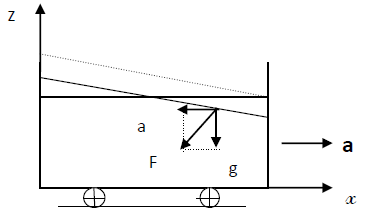 Soit un liquide homogène soumis à une accélération horizontale constante a, comme représenté ci dessous.