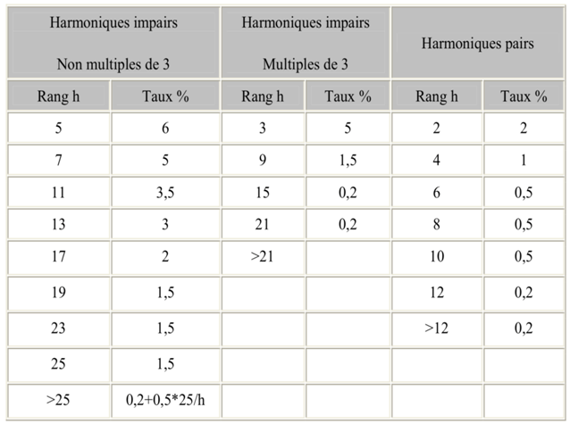 Le tableau3.1, repris de la norme CEI 61000-2-2, présente les caractéristiques et le niveau de compatibilité pour les harmoniques au point de raccordement du client pour un réseau satisfaisant la norme CEI 1000-2-4. Le taux global de distorsion en BT doit ainsi rester inférieur à 8%.