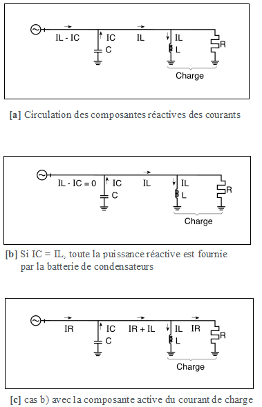 Si une batterie de condensateurs est installée en parallèle sur la charge, son courant réactif (capacitif) suivra le même chemin que le courant réactif (inductif) de la charge dans le réseau en amont : les 2 courants s'additionnent dans le réseau amont. Le courant capacitif Ic (qui est en avance de 90° par rapport au système de tensions) de la batterie de condensateurs est en opposition de phase avec le courant inductif IL (qui est en retard de 90° par rapport au système de tension) et, par suite, les 2 courants s'additionnant dans le réseau amont l'intensité du courant réactif amont résultant sera fortement réduit voir annulé si les courants Ic et IL sont égaux (Ic = IL). Les figures [a] et [b] indiquent la circulation des composantes réactives des courants dont :