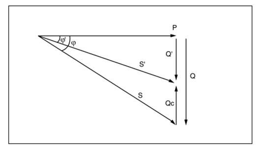 La figure 4.1 reprend le diagramme de la figure L2 pour illustrer le principe de compensation partielle par réduction de la puissance réactive importante Q d'une installation à une valeur plus faible Q' au moyen d'une batterie de condensateurs de puissance réactive Qc. Par suite, la valeur de la puissance apparente de l'installation S a été réduite à la valeur S'.